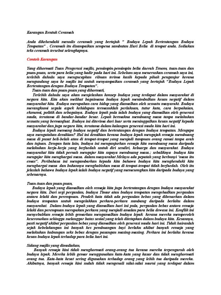 Sediakan teks ceramah anda selengkapnya. Contoh Karangan SPM Bahasa Melayu yang mengikut format terkini KSSM. Membaca memberikan nilai tambah.